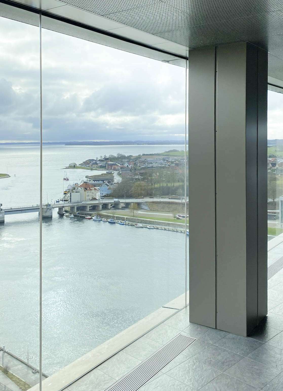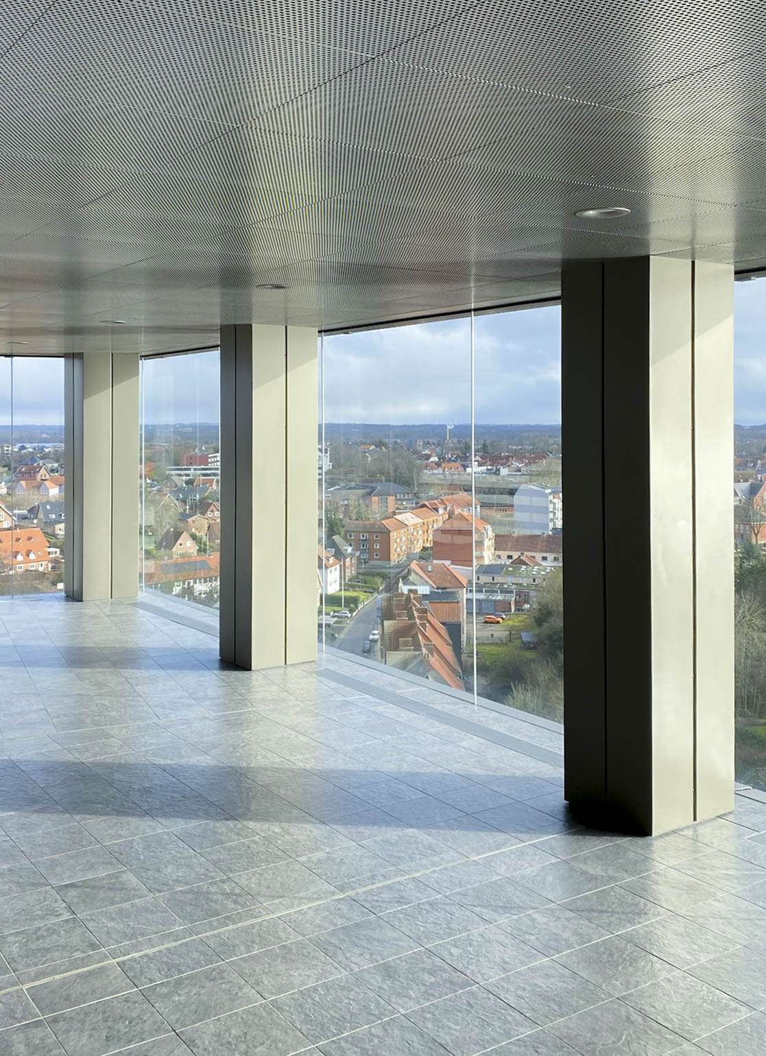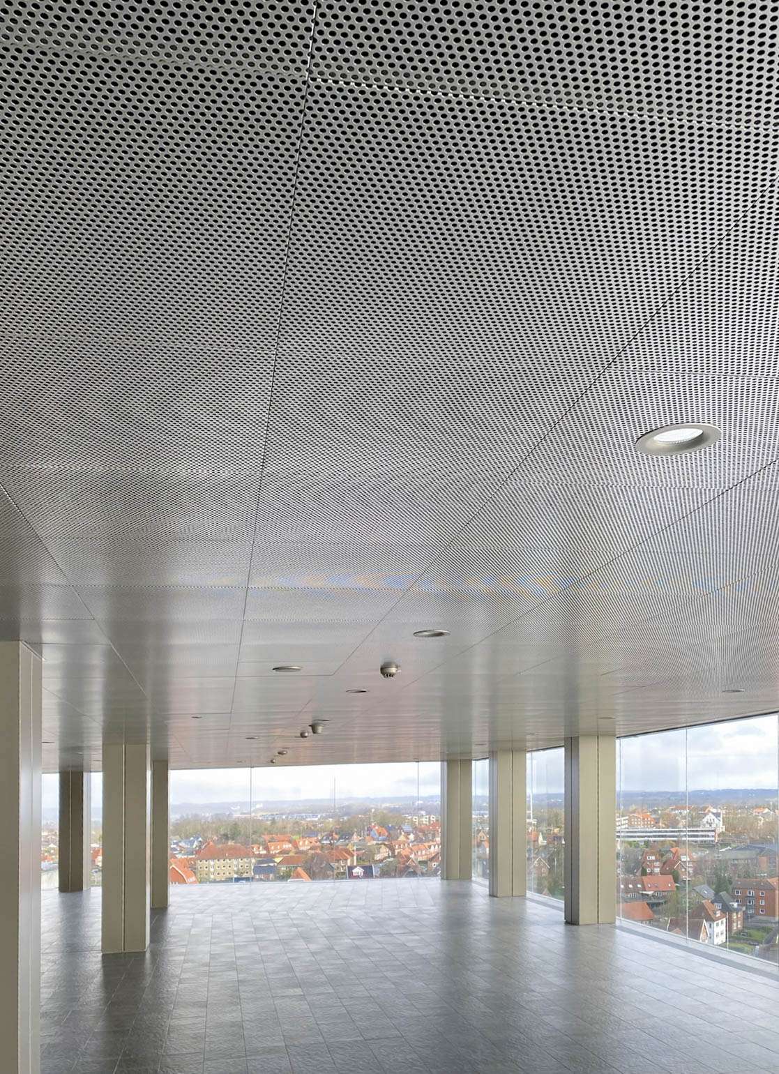 Med den rolige grå farve og store perforationer, skabes et roligt og elegant spil i loftfladen, så loftet ikke tager blikket fra udsigten.