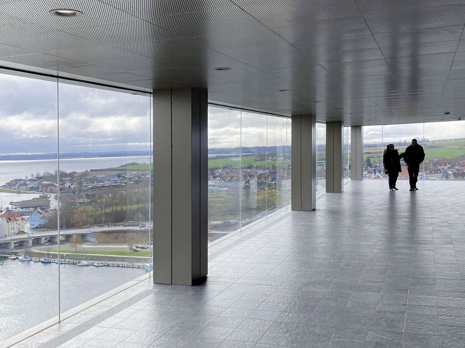 Som loft i Alsik Point of View har man valgt DAMPA® Clip-In Custom kassetter i en perlemusgrå farve. Kassetterne er perforeret med 8 mm huller (ST-8040) og ikke ilagt nogen akustikfilt, så gæsterne får et åbent, dybt kig til den sorte overflade over loftet.
