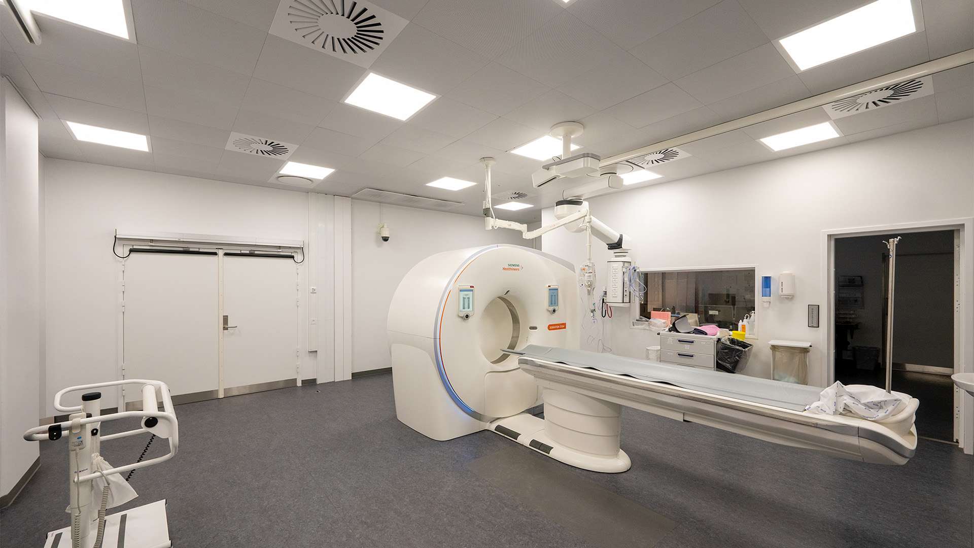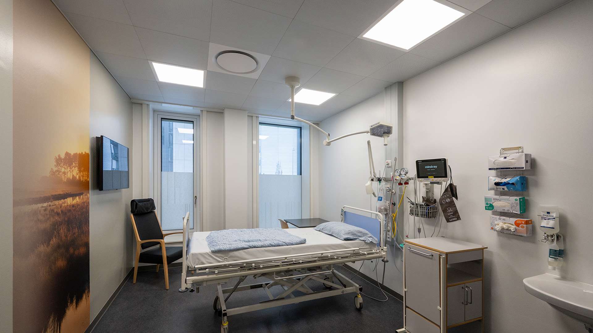 Loftet kombinerer temperaturregulering med de hygiejnekrav, der gælder for et moderne hospital. DAMPA® Klimaloft leverer både varme og køling og bidrager til stabile temperaturforhold året rundt. Panelerne er samtidig lette at rengøre og velegnede til områder med højere hygiejnekrav. Ved at reducere behovet for luftbaseret klimaregulering mindskes den samlede ventilationsmængde, og traditionelle radiatorer kan undværes.